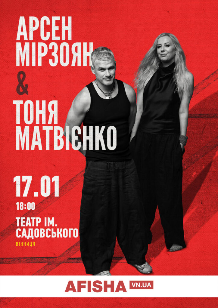 Квитки (від 380 грн) встигніть обрати на сайті https://afisha.vn.ua/events/arsen-mirzoyan-ta-tonya-matviyenko