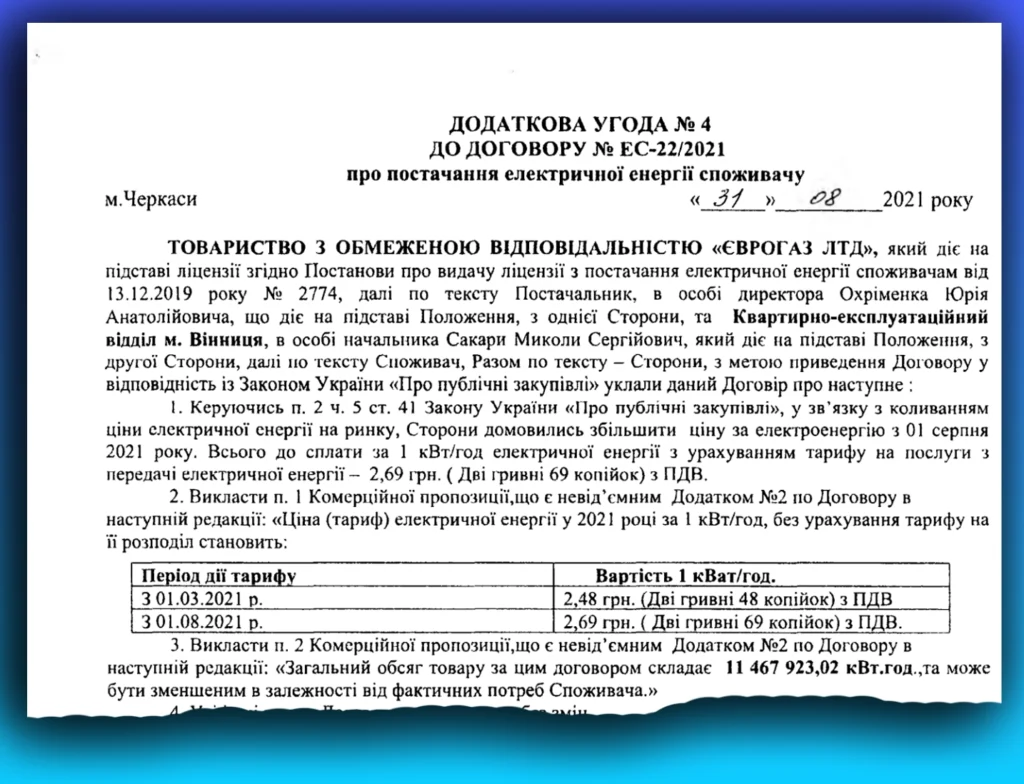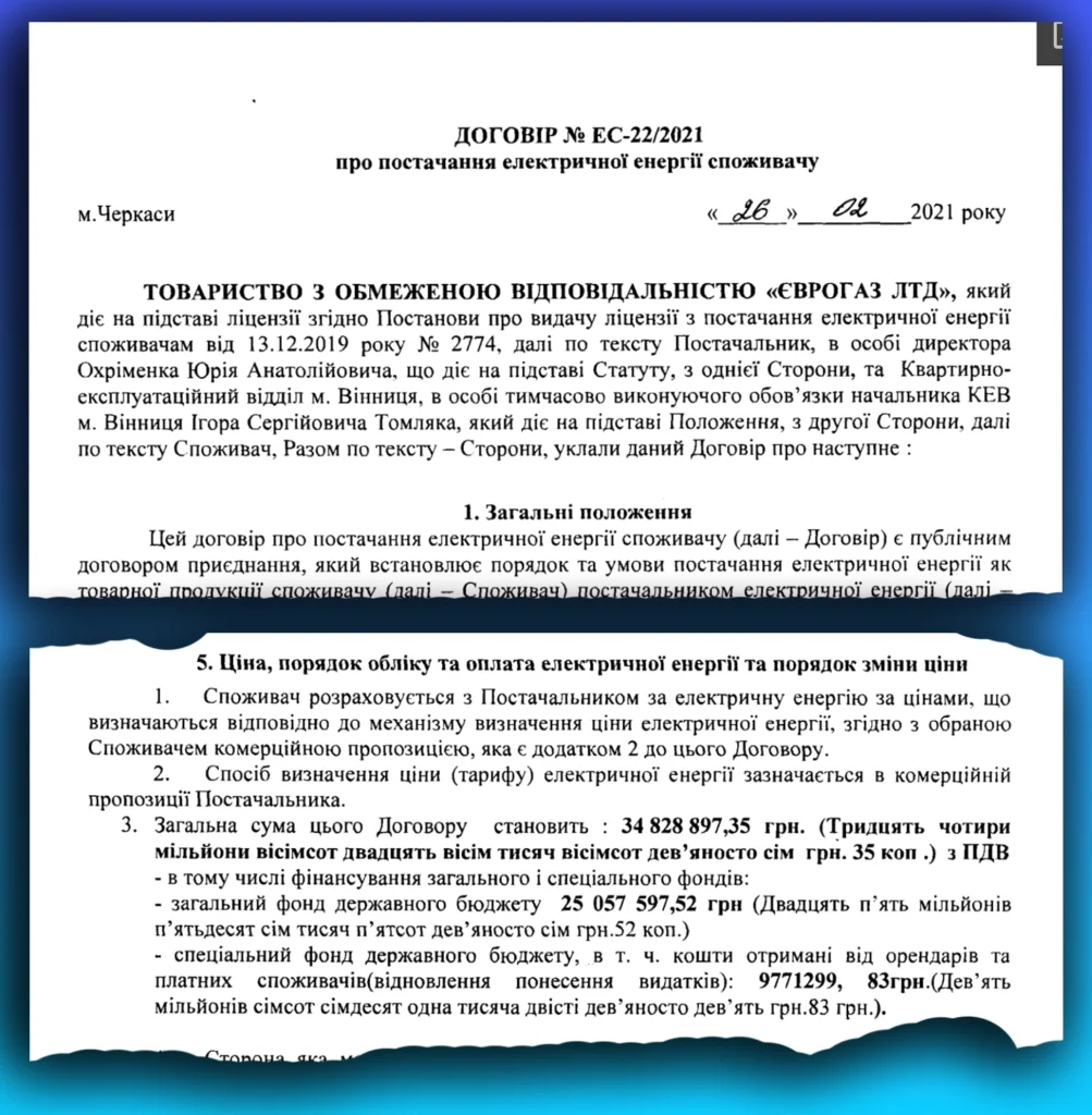 За даними військової прокуратури та ДБР, у лютому 2021 року між КЕВ м. Вінниці та приватним підприємством було укладено договір на постачання електроенергії для потреб військових частин. Сума контракту була солідною — 34,8 мільйона гривень. На той момент документ підписав виконувач обов’язків начальника КЕВ.