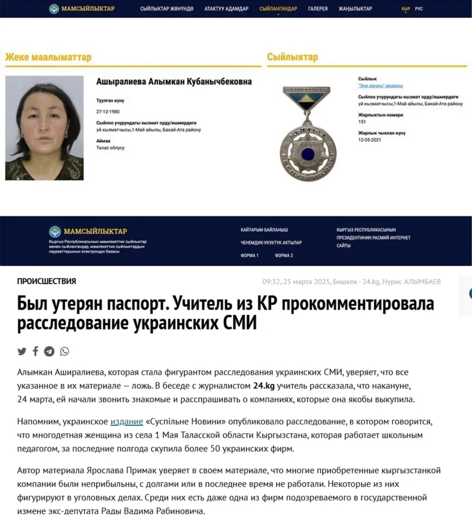 Жінка навіть не підозрювала, що в Україні вона формально володіє цілою низкою бізнесів. Українські журналісти-розслідувачі давно звернули на це увагу і встановили: пані Аширалієва колись втратила паспорт, даними якого скористалися шахраї. Наразі на її ім’я зареєстровано приблизно 50 українських компаній, через які відмивали сотні мільйонів гривень.