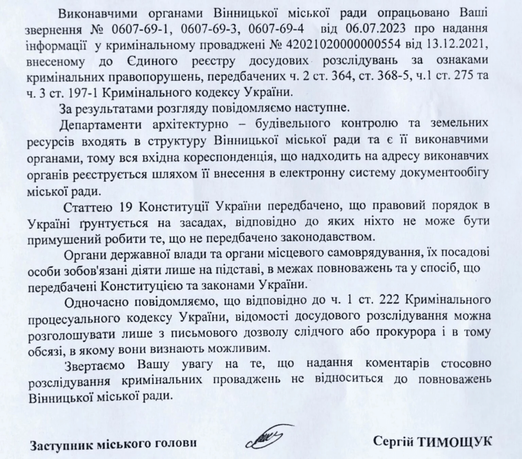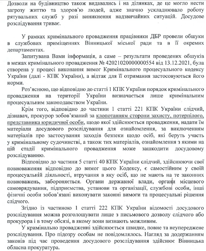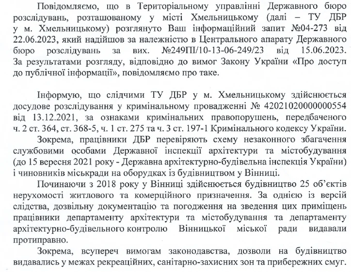 Кримінальне провадження за фактом зловживання владою службовими особами департамента архітектури та містобудування та департамента архітектурно-будівельного контролю, які погодили дозвільні документи на будівництво ряду об’єктів у Вінниці за відсутності правових підстав, було відкрито у грудні 2021 року. Через девʼять місяців – у серпні 2022 року ДБР провела обшуки у відповідних департаментах.