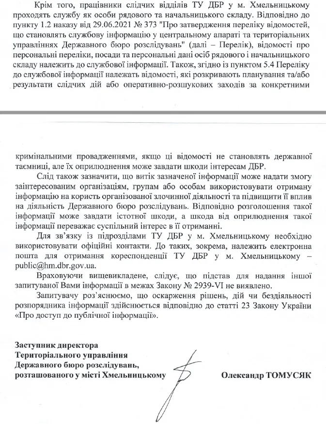 Зазвичай на подібні запити відповідають, що це є таємницею слідства або поки тривають процесуальні дії, то ми вам нічого не скажемо. На цей раз нам відповіли, що запитувана нами інформація: “.. не становлять державної таємниці, але її оприлюднення може завдати шкоди інтересам ДБР. Слід також зазначити, що витік зазначеної інформації може надати змогу заінтересованим організаціям, групам або особам використовувати отриману інформацію на користь організованої злочинної діяльності та підвищити її вплив на діяльність Державного бюро розслідувань. Відповідно розголошення такої інформації може завдати істотної шкоди, а шкода від оприлюднення такої інформації переважає суспільний інтерес в її отриманні…”