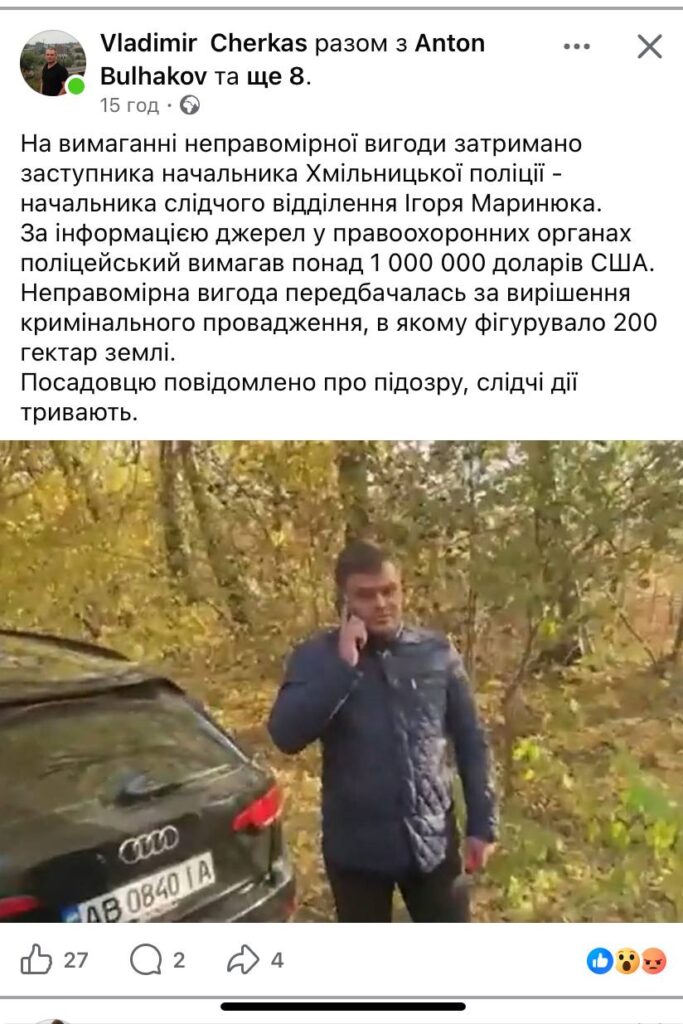 «На вимаганні неправомірної вигоди затримано заступника начальника Хмільницької поліції Ігоря Маринюка. За інформацією джерел, поліцейський вимагав понад 1 000 000 доларів США. Неправомірна вигода передбачалася за вирішення кримінального провадження, у якому фігурували 200 гектарів землі».