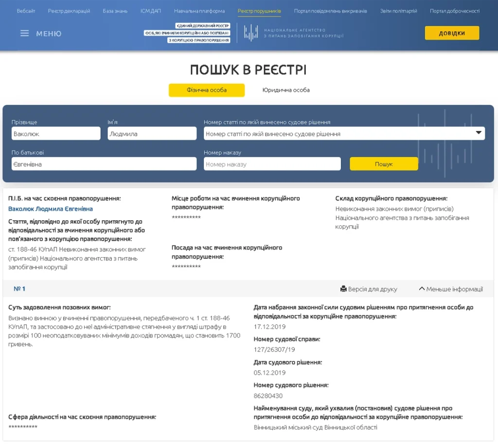 НАЗК кваліфікувало дії Людмили Ваколюк як адміністративне правопорушення, пов’язане з корупцією — за частиною 4 статті 172-6 Кодексу України про адміністративні правопорушення. Йдеться про подання недостовірних відомостей у декларації — на суму, що перевищує сто прожиткових мінімумів. Хоча Агентство і не виявило ознак незаконного збагачення чи конфлікту інтересів, перспектива знову потрапити до Держреєстру корупціонерів для депутатки — цілком реальна.