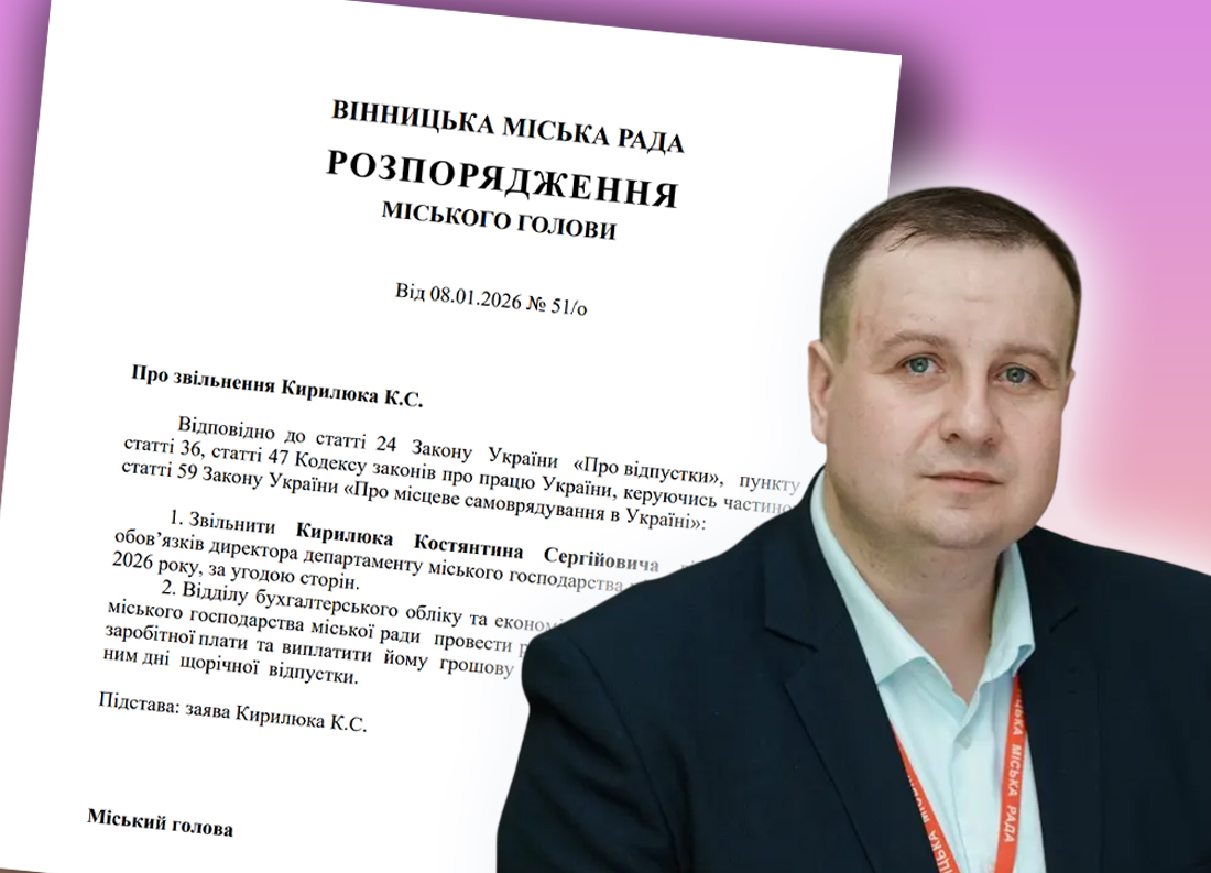 Міський голова Сергій Моргунов підписав розпорядження про звільнення Костянтина Кирилюка з посади директора департаменту міського господарства Вінницької міської ради. Це кадрове рішення було ухвалене через два дні після того, як «Ми Вінничани» оприлюднили інформацію про фігурування посадовця у кримінальному провадженні щодо привласнення бюджетних коштів.