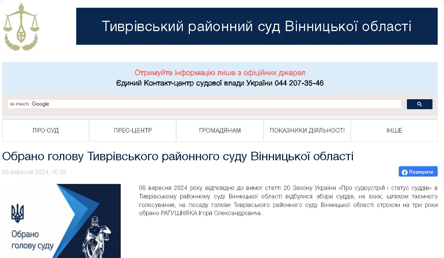 У Тиврівському районному суді Вінницької області «непотоплюваний» суддя-корупціонер продовжує демонстративно підтирати дупу усією вітчизняною системою боротьби з корупцією. За повідомленням прес-служби Тиврівського райсуду, 6 вересня 2024 р. на зборах суддів шляхом таємного голосування на посаду голови суду на новий трирічний термін знов обрано Ігоря Ратушняка, якого Вищій антикорупційний суд (ВАКС) за отримання хабаря у розмірі 4620 доларів США 12 грудня 2023 р. засудив до 7 років позбавлення волі.