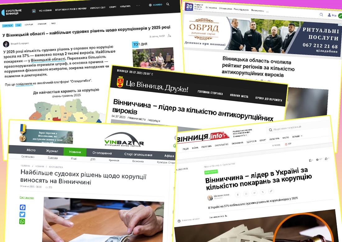 Вінниччині знову є чим хвалитись — місцеві ЗМІ зарясніли заголовками на кшталт: «Найбільше антикорупційних вироків — на Вінниччині»,«Лідер за кількістю рішень у справах про корупцію» тощо. Приводом стала аналітика від платформи Opendatabot (надає доступ до державних даних з основних публічних реєстрів для громадян та бізнесу) із підсумками перших п’яти місяців 2025 року за кількістю судових рішень у справах про корупційні та пов’язані з корупцією правопорушення.