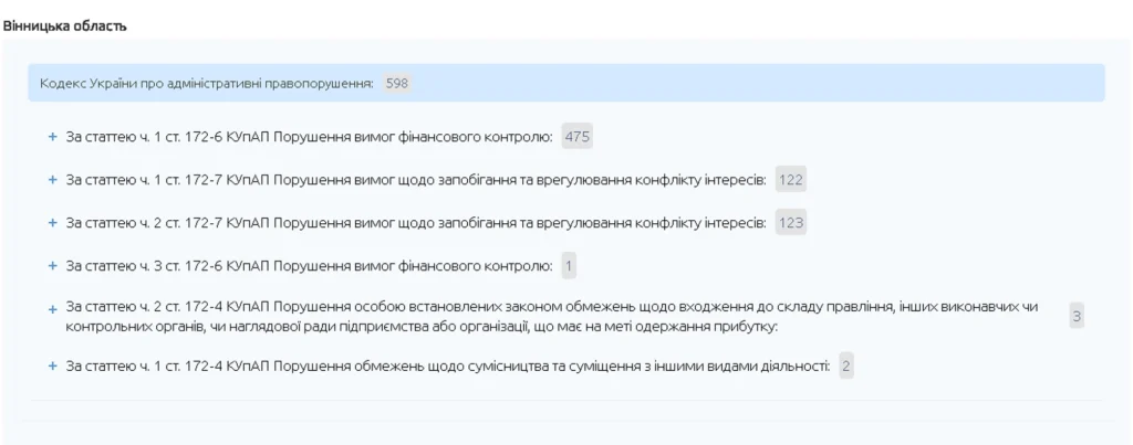 Щодо адміністративних корупційних правопорушень, то ситуація ще показовіша: з початку війни у реєстрі зафіксовано 598 таких випадків на Вінниччині. Це виводить область на третю позицію — попереду навіть чисельнішої Дніпропетровщини (548). Лідерами залишаються Одеська область — 739 записів, та знову ж таки Львівська — 640.