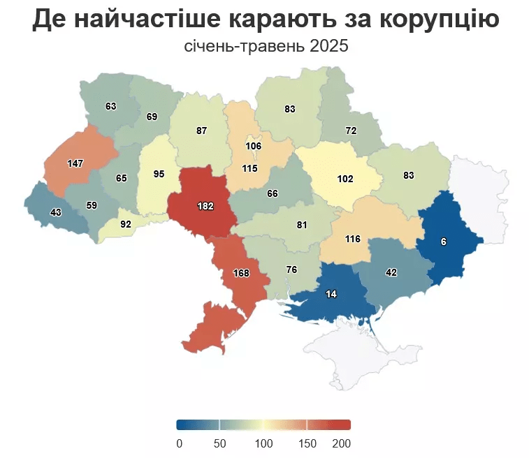 Абсолютним лідером за кількістю вироків стала Вінницька область — 182 рішення, або 9% від загальної кількості. Її наздоганяють Одеська (168 рішень), Львівська (147), Дніпропетровська (116) та Київська (115) області.
