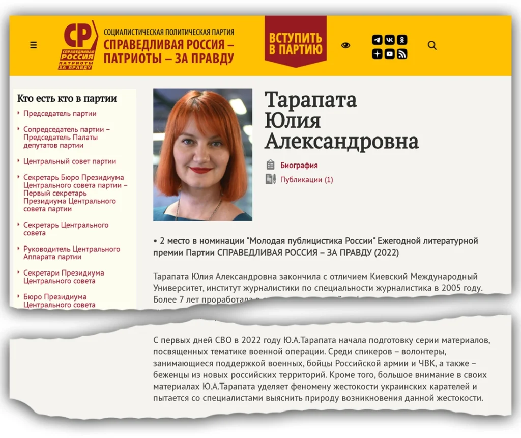 А поки що звертає на себе увагу інше. Тарапата виправдовує злочини російських окупантів, називає катівні й масові поховання в Бучі та Ірпені «постановочними». Вона відверто захоплюється тими, хто чинив масові вбивства, і навіть присвячує інтерв’ю їхнім «подвигам». За свою діяльність Тарапата регулярно отримує нагороди від Кремля та московської влади.
