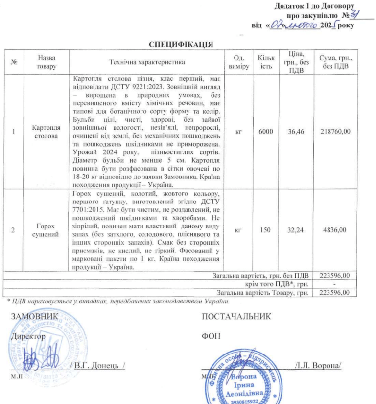 І в закупівлі від 23 січня 2025 року на 150 кг гороху та 6 тон картоплі (так-так, знову картопля і знову тони) участь беруть три пропозиції: від ТОВ «ОМЕГА-К ТРЕЙД» (159 750 грн), ФОП ШЕВЧУК ЄВГЕН АНАТОЛІЙОВИЧ (196 500 грн) і ФОП Ворона І.Л. (223 596 грн). Вгадайте, хто переміг? Правильно, ФОП Ворона із найдорожчою пропозицією. ФОП Шевчук відмовився, бо з 23 січня, коли він подав пропозицію, до 5 лютого, коли він написав відмову, дуже сильно здорожчало паливо і йому стало невигідно працювати.