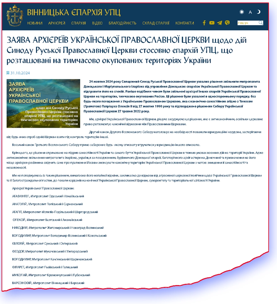 Високопоставлені попи також наголошують, що призначення російського архієрея на місце Іларіона, українця за походженням, свідчить про прагнення Москви анексувати канонічну територію УПЦ і знищити її самостійність та незалежність. «Ми не погоджуємось із таким рішенням, вимагаємо його негайної відміни, закликаємо до відмови від агресивної церковної політики щодо Української Православної Церкви та її багатостраждальної пастви, до поваги кордонів канонічної Української Православної Церкви, суверенітету та територіальної цілісності України», – підсумовують архієреї УПЦ, які підписали заяву.