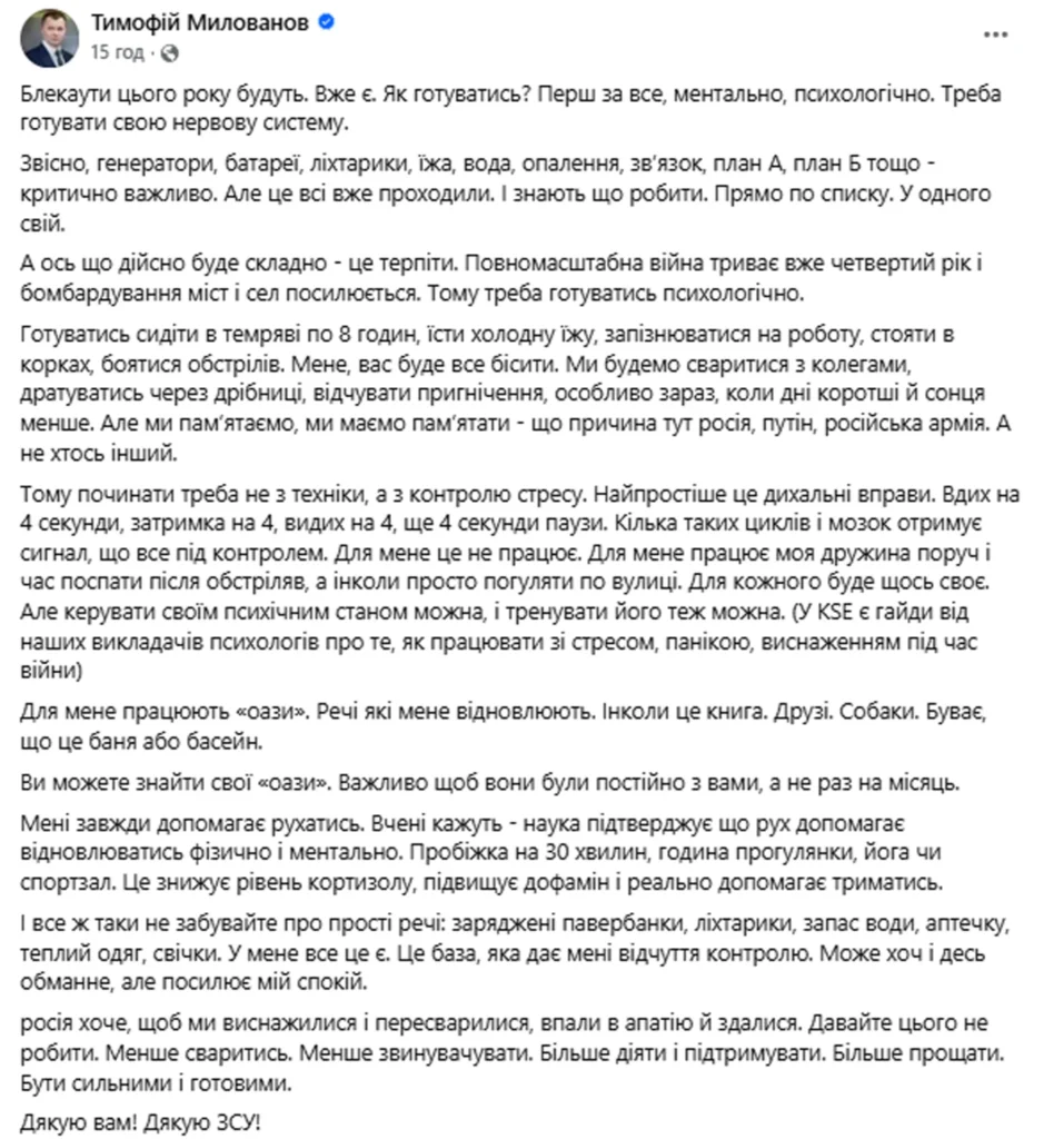 На своїй сторінці у Facebook Милованов заявив, що відключення світла цього року в Україні «будуть і вже є». Він закликав громадян готуватися до цього, наголосивши, що починати слід не з технічних засобів, а з психологічної підготовки.