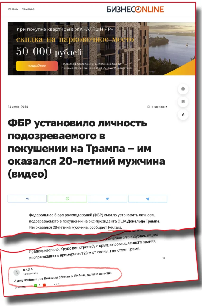 «З інтересом чекав, хто першим запропонує ідею, що на Трампа напали злісні українські бандерівці, підбурювані агресивними натівськими військовими. Думав, це буде черговий педофіл-американець», – так почав власний «розбір польотів» російської пропаганди військовий аналітик, колишній радник міністра оборони України та координатор «Інформаційного спротиву» Олексій Копитько.