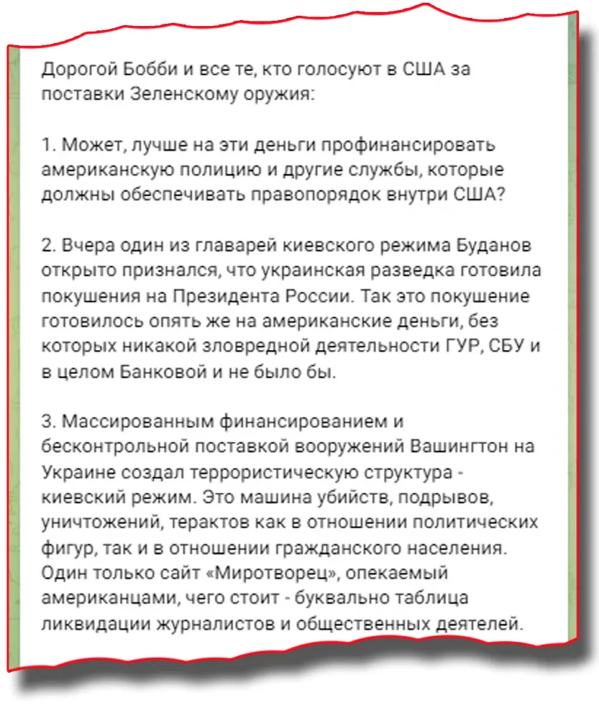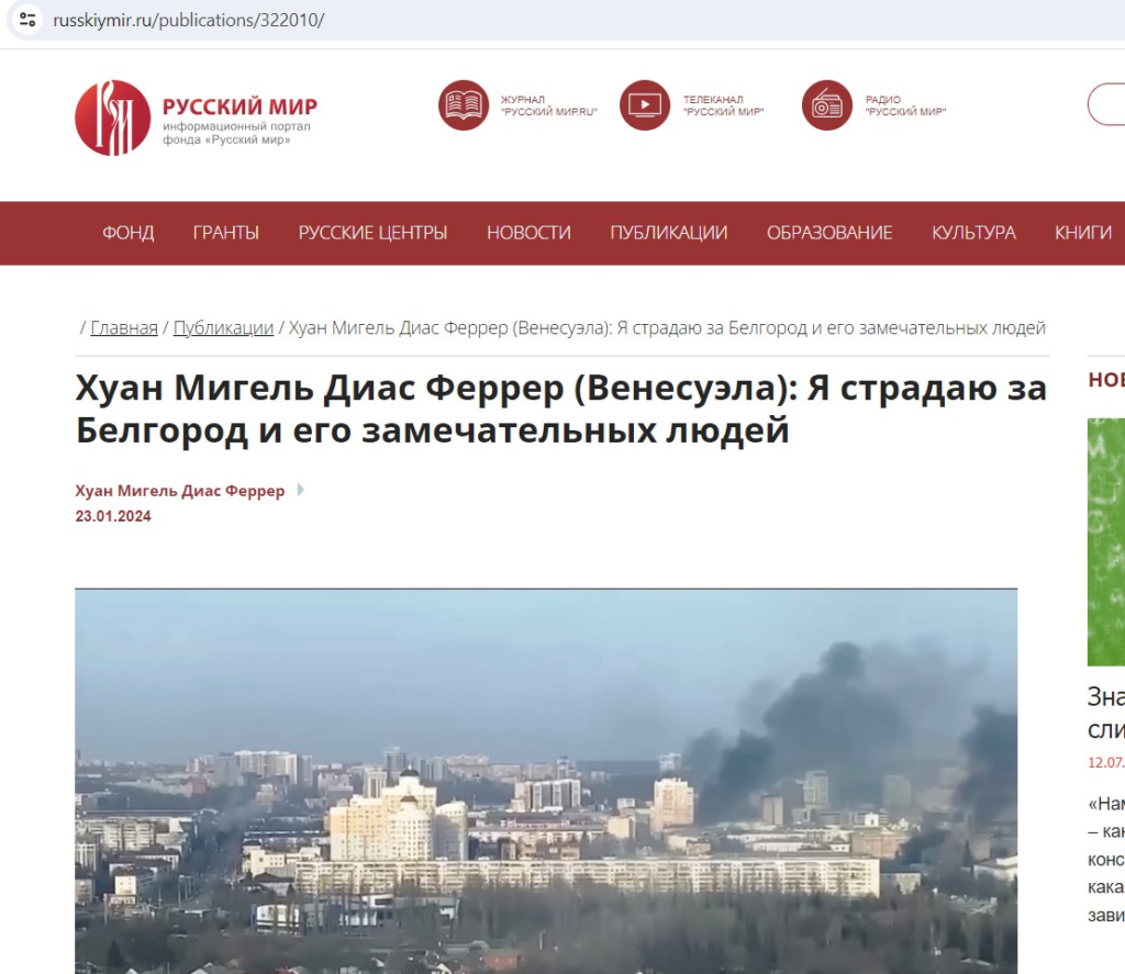 «Я переглянув деякі публікації фігуранта в оригінальному венесуельському виданні – тепер буду регулярно його читати для підняття настрою. Наприклад, один з останніх творів навіть не потребує перекладу: «Ucrania: terrorismo de Estado internacional». (Для порівняння: про рф остання публікація з заголовком «Росія: здоровий глузд проти розпалювачів війни»). Якщо коротко. Росія – це невелика миролюбна країна, оточена з усіх боків злісною воюючою Україною, де править «фашистський терористичний режим Києва». На гроші заходу «в центрі Європи створено ІДІЛ», тільки більш сильний і страшний. Бо київські фашисти – це вам не якісь обідрані в пов’язках на бедрах і у шльопанцях. З 2016 року (!) український режим тримає в страху Москву і проводить терористичні акти по всій росії (!!!). З початком СВО ці атаки стали більш зухвалими і руйнівними. Венесуельський талант заносить до списку досягнень «українських фашистів»: Крокус, недавні події в Дагестані, а також стрільбу російської ППО по людях…», – резюмує координатор «Інформаційного спротиву».