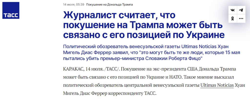 ТАСС трохи розчарував – озвучив цю геніальну думку зі посиланням на «венесуельського журналіста» Хуана Мігеля Діаса Феррера, який працює у виданні «Últimas noticias» («Останні новини»). По-перше, це свідчить, що ближче ідіотів не знайшлося. По-друге, спікер – максимально скандальний. В оригінальній новині ТАСС навіть посоромився дати посилання на венесуельську газету і замість цього навів лінк на розділ іспанської газети El Mundo, що відразу вказує на якийсь підступ.