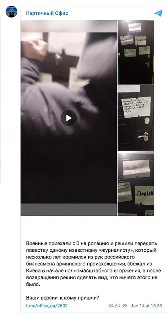 За словами журналіста, через 15 хвилин після цирку, влаштованому у під’їзді його будинку, на анонімному Telegram-каналі «Карточный офіс» (який пов’язують з Офісом президента) були опубліковані відео та фото. На відео видно, як в двері, обклеєні папірцями з написами «зрадник», «ухилянт» та ін., стукають чоловіки. Один з них каже: «Будемо розмовляти зараз з тобою. Ти по відео дуже гарно вмієш розмовляти».
