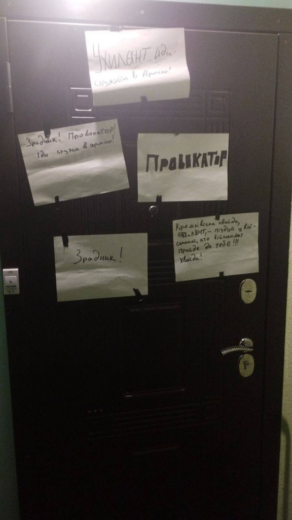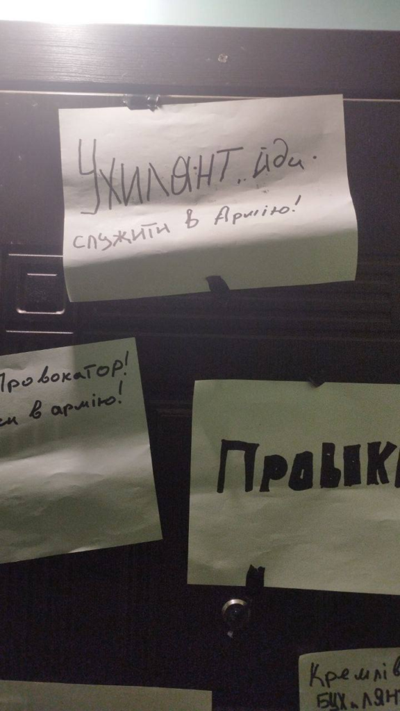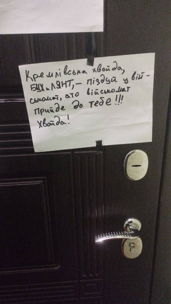«Вчора ввечері мені і моїм сусідам влаштували скандал. Якісь чуваки ломились в двері, кричали, щоб я йшов служити, обклеїли двері папірцями. Мене не було вдома, ходив до друга … Тому ці уроди лише налякали мою стареньку маму, що після онкології живе зі мною, бо більше ні з ким – другий син в Авдіївці, дорослий онук – на Куп’янському напрямку… Я навіть не знаю, якому дегенерату прийшла в голову така ідея по залякуванню журналіста», – розповів Юрій Ніколов.