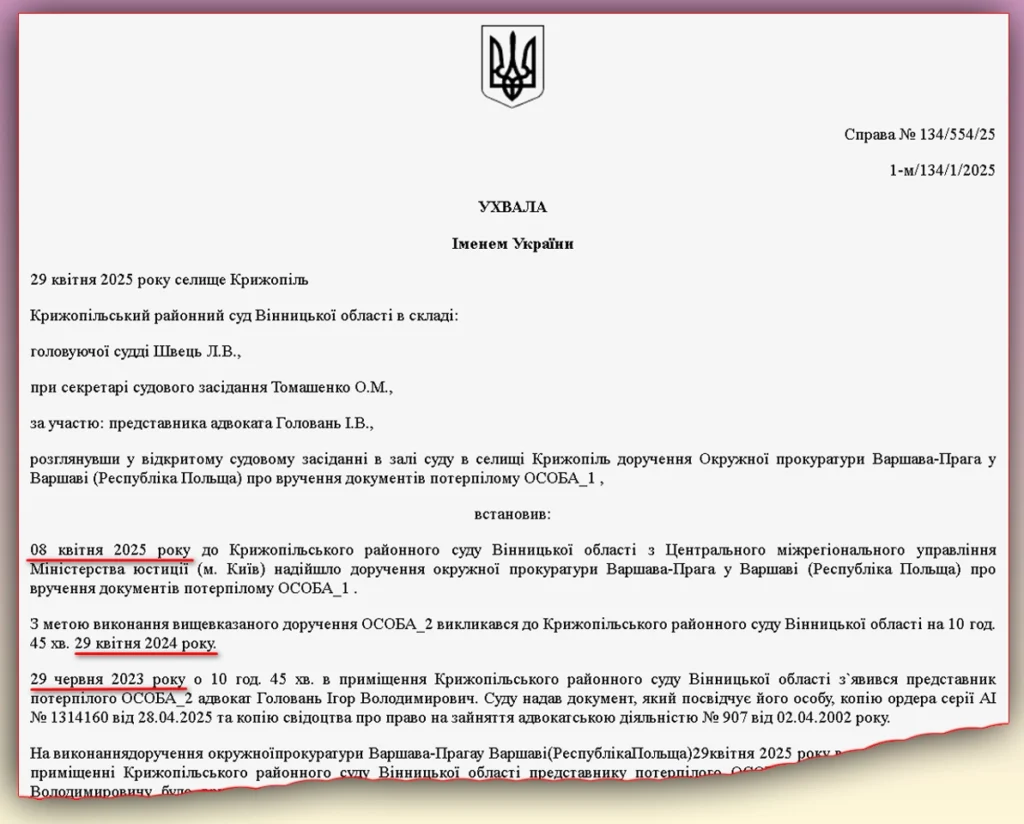 Досить незвична для районної юрисдикції подія відбулася у Крижопільському районному суді Вінницької області. Сюди надійшло міжнародне доручення від окружної прокуратури Варшава-Прага (Польща). 29 квітня 2025 року український суд виконав запит польських колег, вручивши судові документи у справі, де потерпілим зазначено п’ятого президента України Петра Порошенка.
