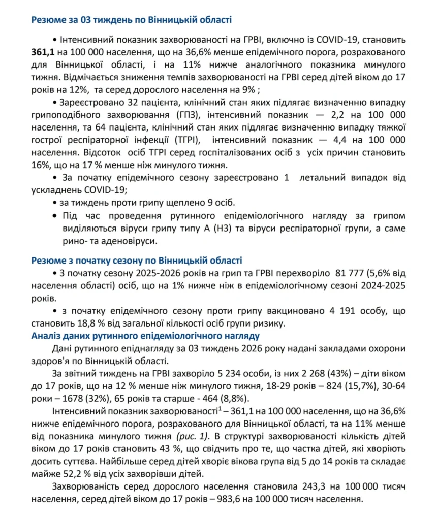 Рівень вакцинації залишається низьким: за тиждень щеплення проти грипу отримали лише 9 осіб. З початку епідемічного сезону вакциновано 4 191 особу, що становить менше ніж 19% від загальної кількості осіб із груп ризику.