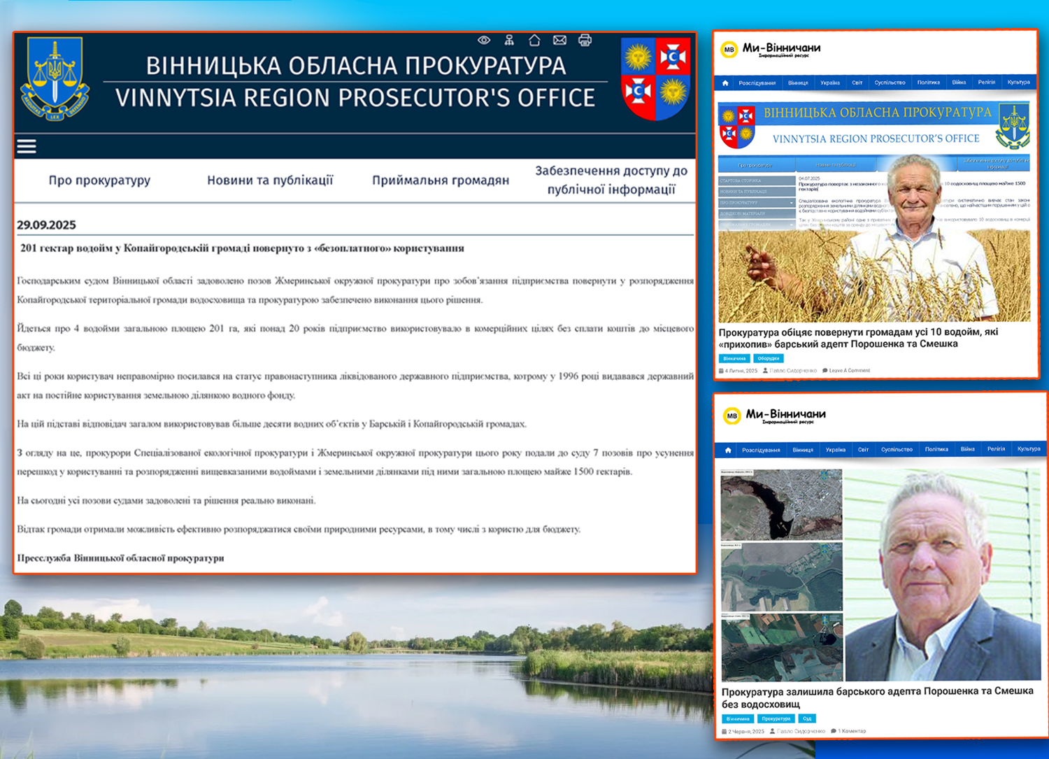 Також зазначається, що прокурори Спеціалізованої екологічної та Жмеринської окружної прокуратур цьогоріч подали до суду 7 позовів про усунення перешкод у користуванні та розпорядженні вказаними водоймами і земельними ділянками під ними загальною площею майже 1500 га. У прокуратурі зазначили, що на сьогодні всі позови судами задоволені, а рішення виконані.