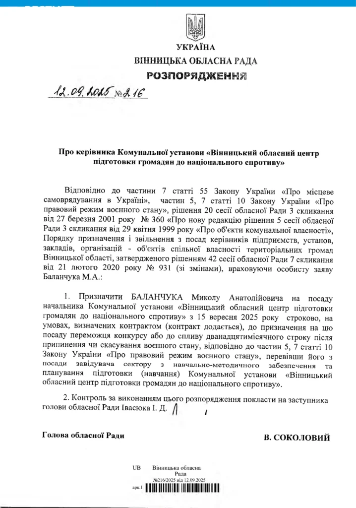 12 вересня 2025 року голова облради В’ячеслав Соколовий підписав розпорядження про призначення Миколи Баланчука керівником нацспротиву на Вінниччині. Він офіційно вступає на посаду з 15 вересня 2025 року — «строково, на умовах контракту, до призначення переможця конкурсу або до спливу дванадцяти місяців після припинення чи скасування воєнного стану».