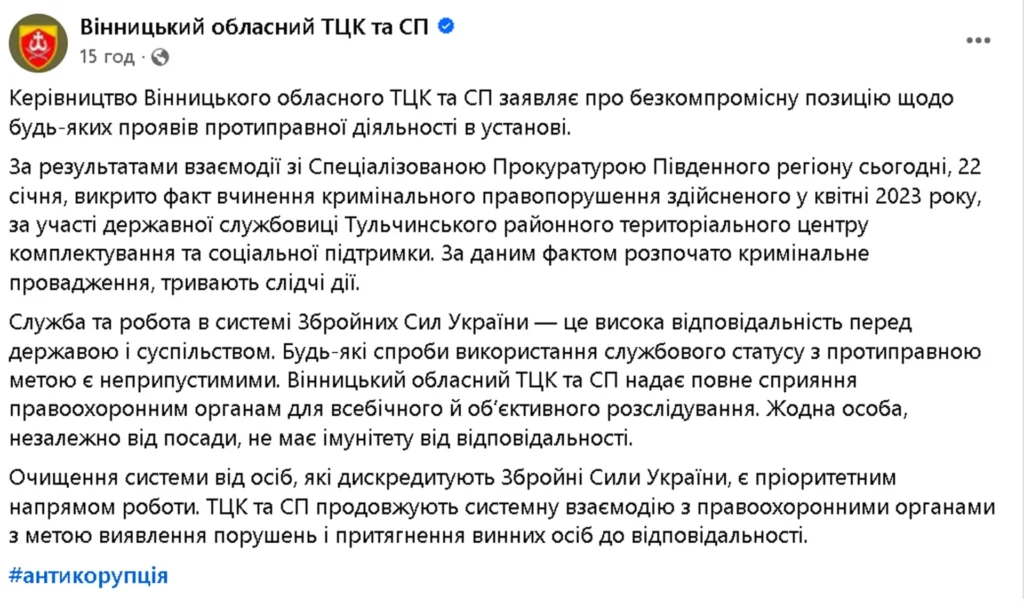 За результатами взаємодії зі Спеціалізованою прокуратурою Південного регіону, 22 січня було викрито факт вчинення кримінального правопорушення, яке, за даними слідства, мало місце у квітні 2023 року. Йдеться про дії державної службовиці Тульчинського районного територіального центру комплектування та соціальної підтримки. За цим фактом відкрито кримінальне провадження, тривають слідчі дії.