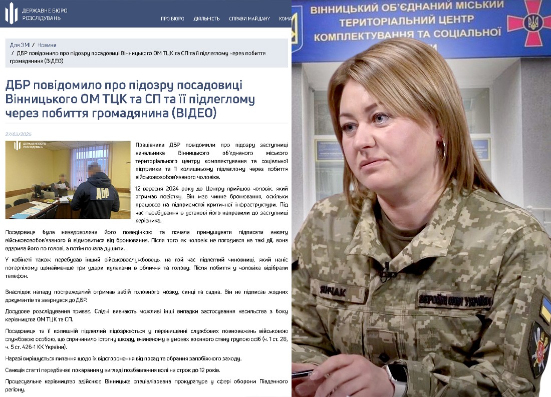 Державне бюро розслідувань (ДБР) фактично підтвердило інформацію про інцидент, правда, не називаючи прізвищ причетних до нього співробітників ТЦК. Правоохоронці повідомили про підозру заступниці начальника Вінницького об’єднаного міського ТЦК та СП та її колишньому підлеглому через побиття військовозобов’язаного.