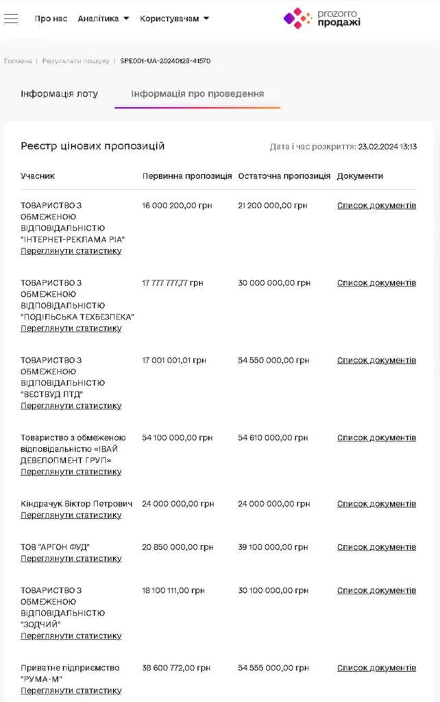 Столична компанія запропонувала 54,61 млн. грн. Дещо менше готове було вкласти львівське ПП «Рума-М» (54,555 млн. грн.) і фірма «Вествуд ЛТД» з Чернівецької області (54,550 млн. грн.). Решта учасників аукціону, зокрема з вінницькою «пропискою», пропонували менше 40 мільйонів.