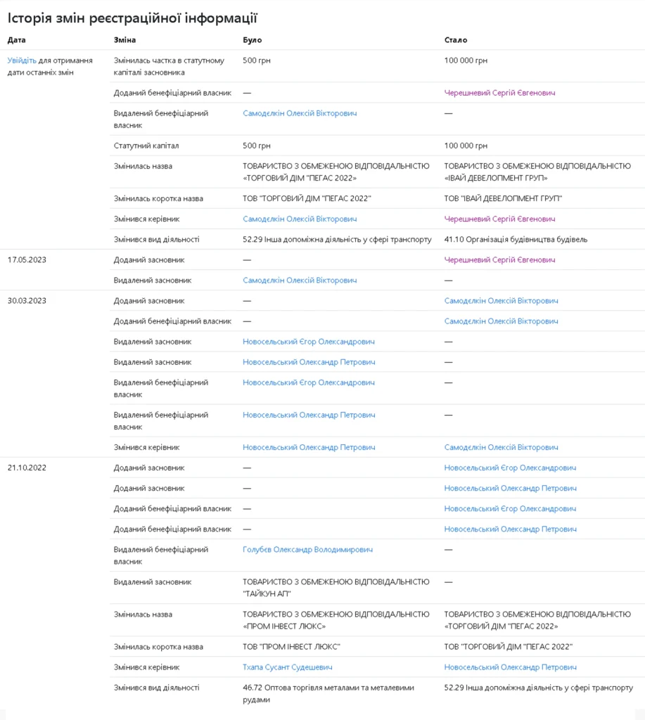 Компанія «Івай Девелопмент Груп» була зареєстрована у вересні 2022 р. і спочатку мала назву ТОВ «Пром Інвест Люкс», а трохи пізніше – ТОВ «Торговий дім «Пегас 2022». Компанія займається організацією будівництва. За півтора року існування у ТОВ «Івай Девелопмент Груп» змінилося декілька бенефіціарних власників, причому, кожен з них значився керівником або засновником багатьох десятків інших фірм. У кінці 2023 р. керівником і власником ТОВ «Івай Девелопмент Груп» став вінничанин Сергій Черешневий.