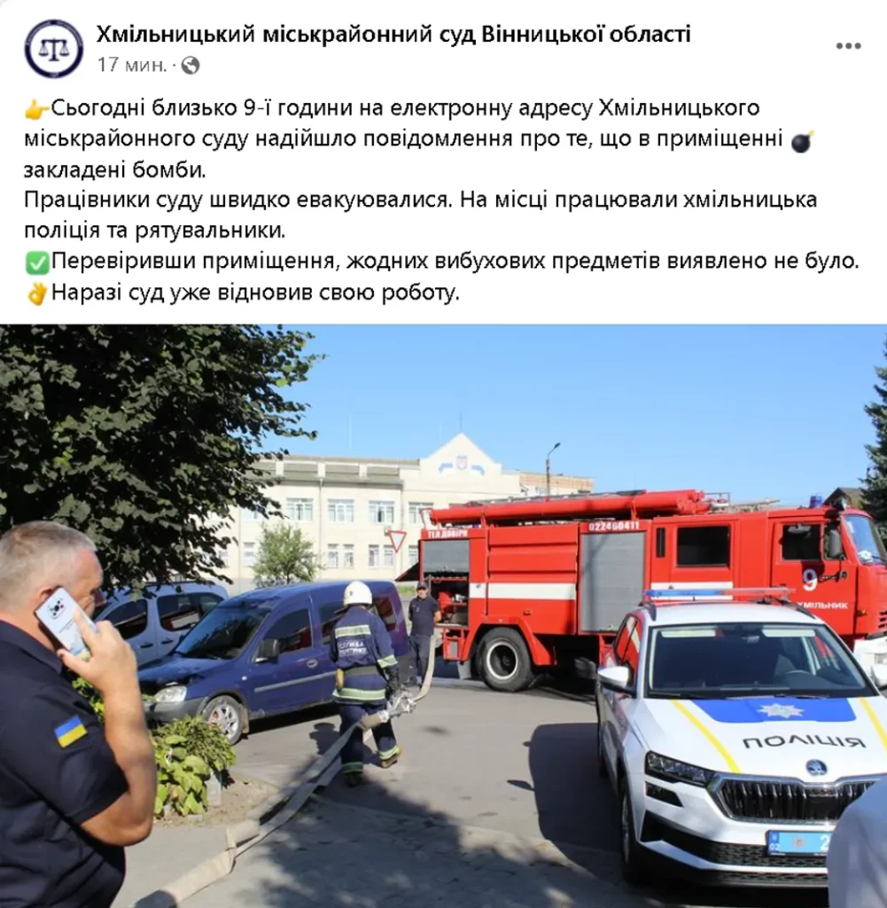 У Хмільницькому міськрайонному суду Вінницької області про замінування повідомили у 10:34: