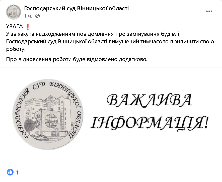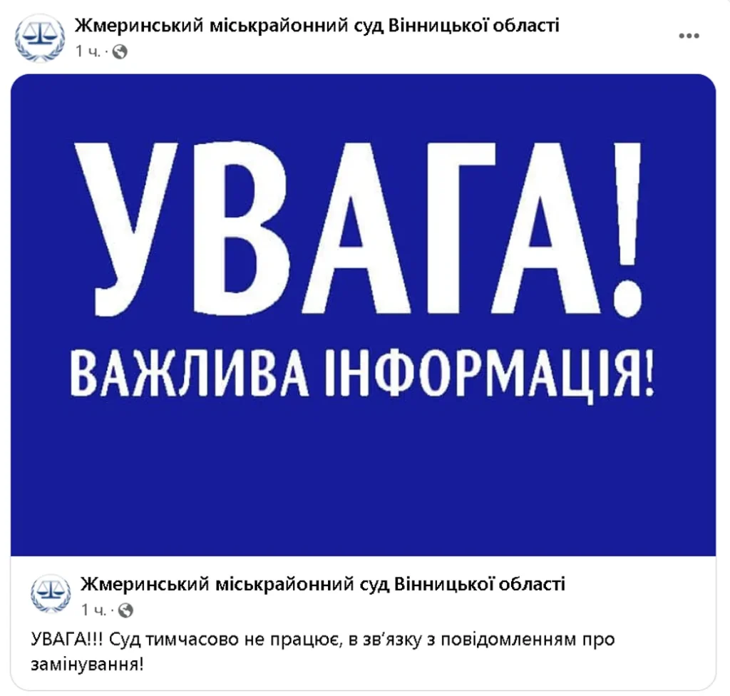 23 серпня 2024 р. в День державного прапора на Вінниччині надходять чисельні повідомлення про замінування будівель судів.