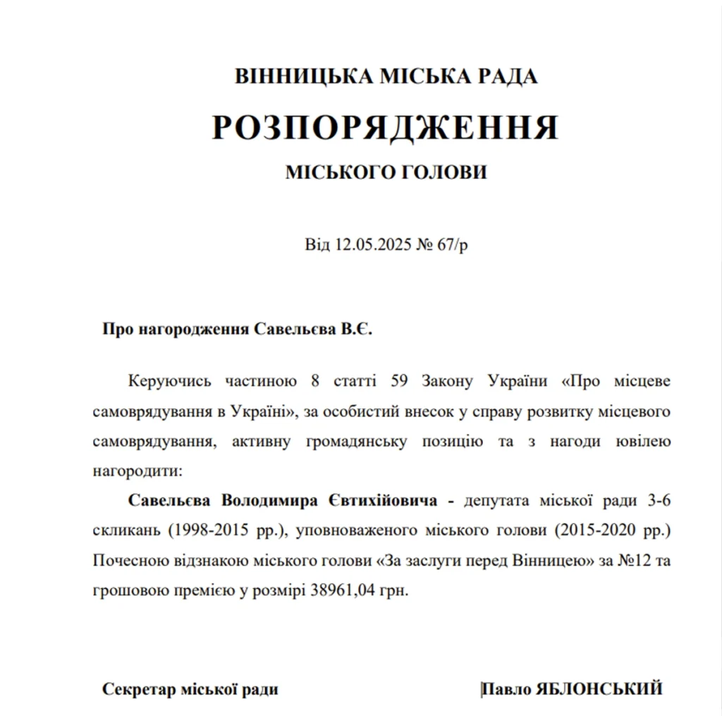 12 травня 2025 року секретар міськради Павло Яблонський розпорядився вручити чергову таку нагороду — почесний знак «За заслуги перед Вінницею» №12 — Володимиру Савельєву, додавши до неї грошову премію в розмірі 38 961,04 гривень. Формальне обґрунтування — «за особистий внесок у розвиток місцевого самоврядування, активну громадянську позицію та з нагоди ювілею».