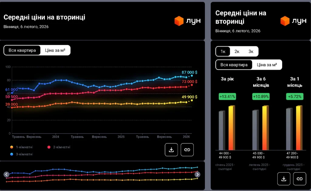 Протягом 2025 року ціни на житло у Вінниці зросли здебільшого на вторинному ринку. Натомість новобудови залишилися відносно стабільними. Найбільший стрибок спостерігався на ринку оренди: однокімнатні квартири подорожчали одразу на 22%.