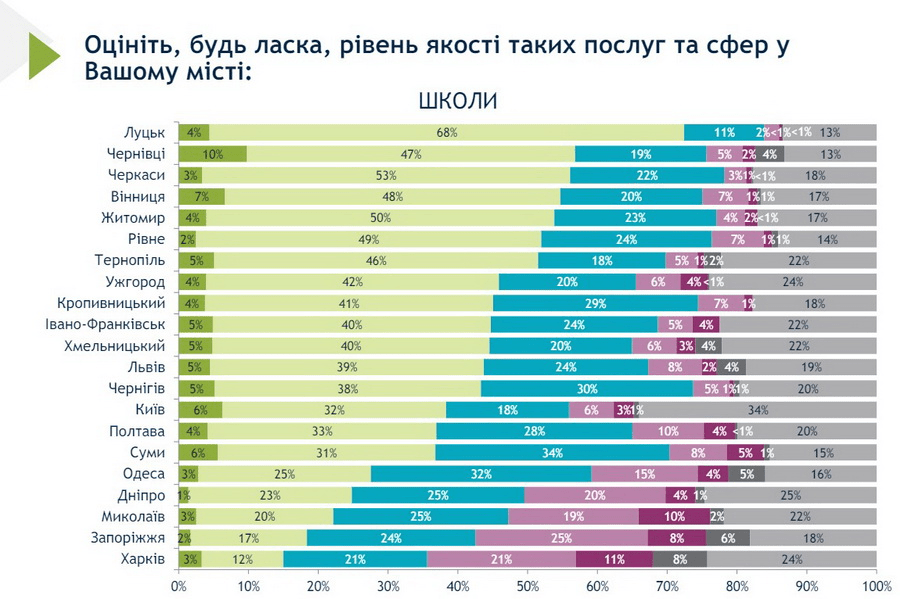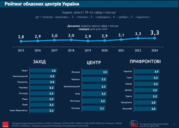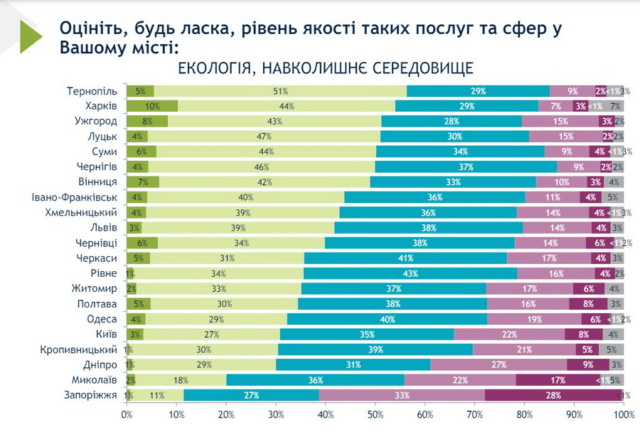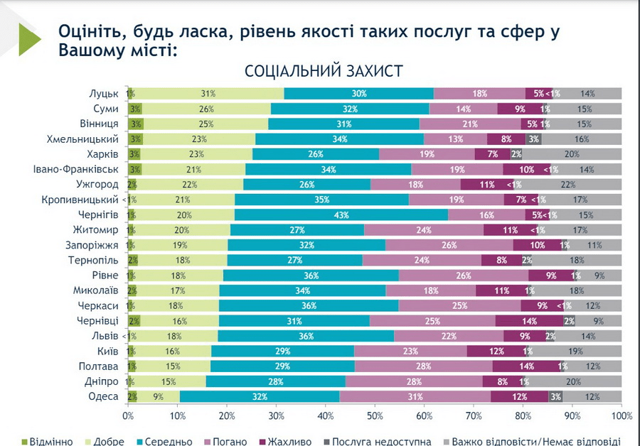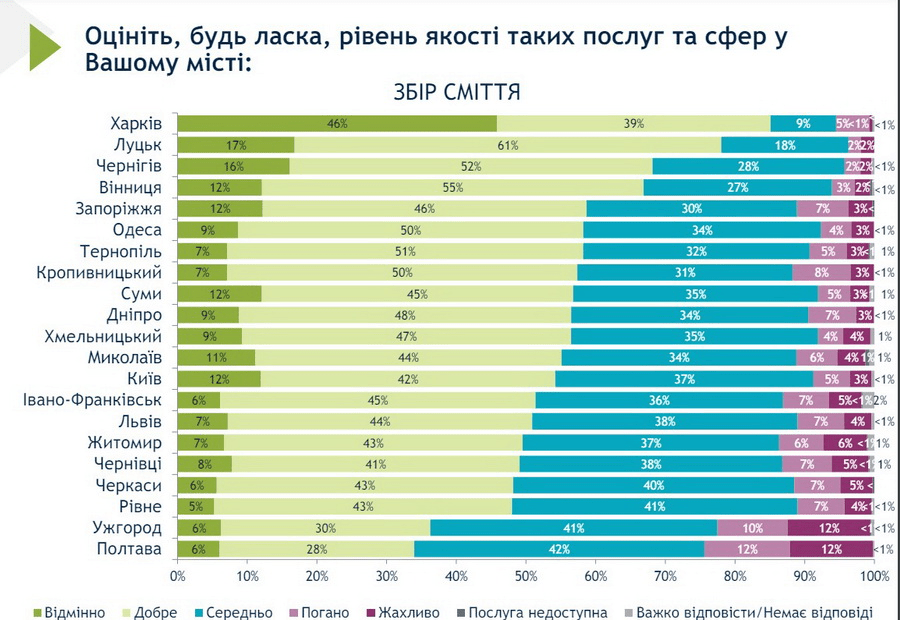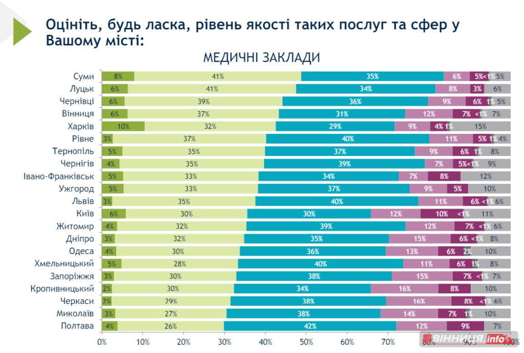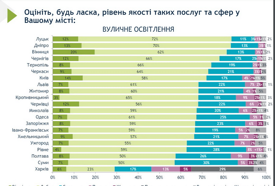 Четвертим серед 19 українських міст є показник Вінниці щодо вивозу сміття та роботи медзакладів. Схвальну оцінку дали, відповідно, 67% і 43% вінничан. За рівнем вуличного освітлення Вінниця на третій сходинці (82% опитаних оцінили цю сферу позитивно).