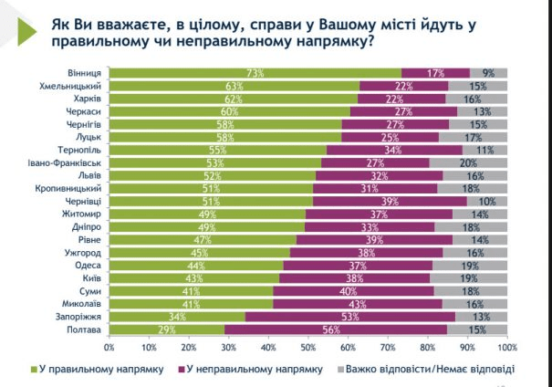 Тим не менш, на запитання, як у місті йдуть справи – у правильному чи неправильному напрямку, 73% опитаних вінничан відповіли, що у «правильному». І це найбільший показник серед інших українських міст. Лише 17% вінничан вважають, що справи у Вінниці ідуть у неправильному напрямку.