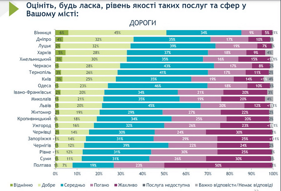 Якість доріг 51% опитаних вінничан оцінили на «відмінно» чи «добре», а схвальну оцінку «розвиту промисловості» дали 25%.