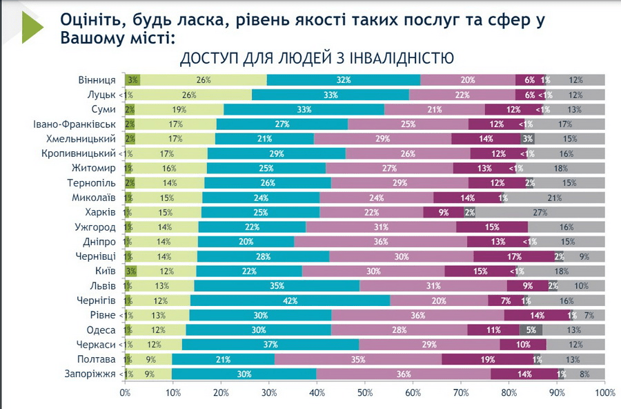 Лідером опитування Вінниця стала також у категорії «доступ для людей з інвалідністю» (29% позитивних відгуків). Більшість опитаних схвалює діяльність міського голови та міськради. В обох категоріях у Вінниці 4-ий результат по Україні.