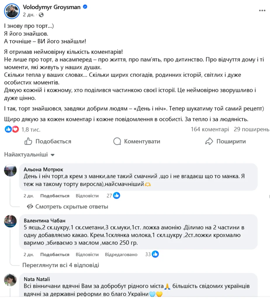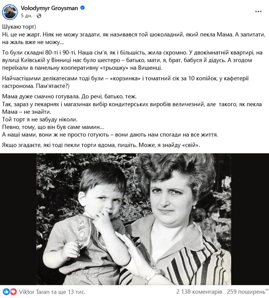 Продовжуючи солодкі спогади, Гройсман перейшов до своєї біди і звернувся до «колективного розуму» аудиторії по допомогу. Мовляв, він ніяк не може згадати назву того шоколадного торта, який пекла його мама. «Якщо згадаєте, які тоді пекли торти вдома, пишіть. Може, я знайду «свій», — звернувся Гройсман до користувачів соцмереж.