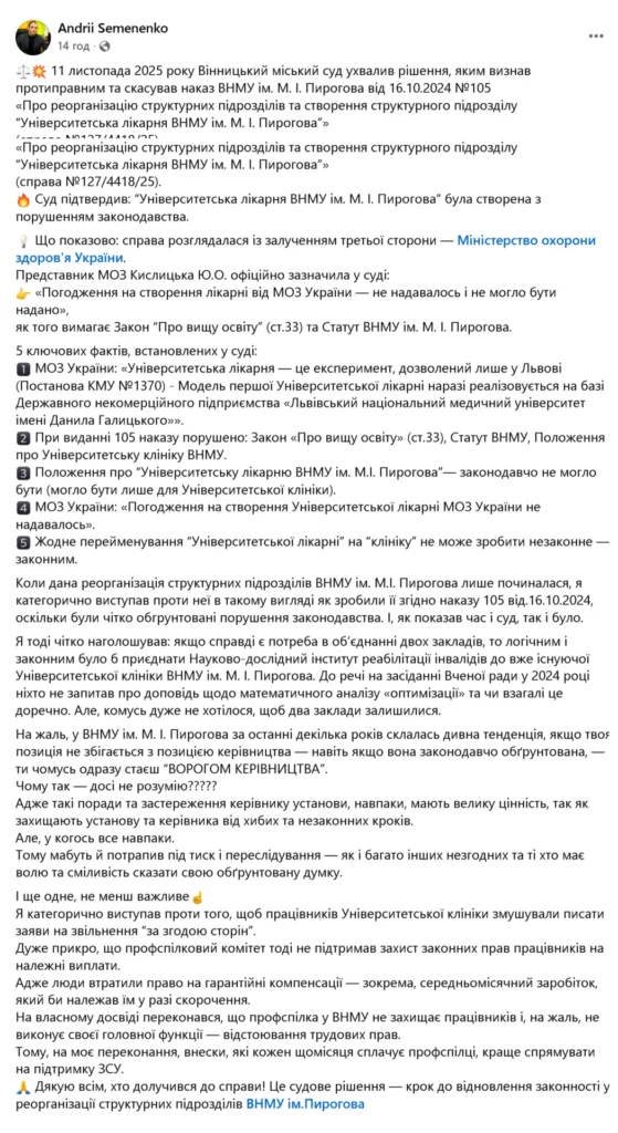 Вінницький національний медичний університет ім. М. І. Пирогова не перестає перебувати у центрі судових процесів. Після обрання ректоркою Вікторії Петрушенко у квітні 2024 року виш фактично перетворився на поле безперервних юридичних баталій — здебільшого через звільнення, поновлення на посадах і спірні управлінські рішення. Черговою гучною справою стала перемога професора Андрія Семененка, який у суді довів незаконність створення Університетської лікарні.