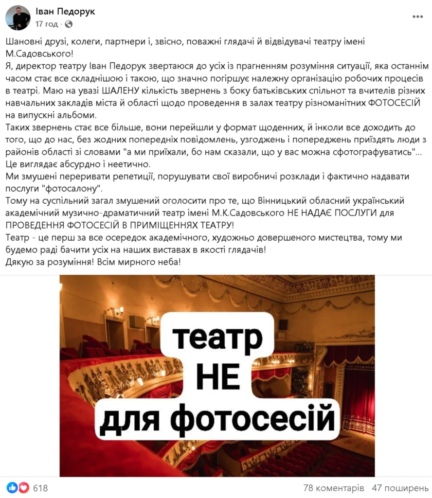 Директор Вінницького обласного українського академічного музично-драматичний театр ім. Миколи Садовського Іван Педорук емоційно звернувся до громадськості у соцмережах. За його словами, останнім часом адміністрацію театру буквально «засипають» проханнями провести у приміщенні фотосесії для випускних альбомів. Причому деякі відвідувачі, за словами керівника, навіть приїздять із районів області без попередження — просто тому, що «їм сказали, що тут можна сфотографуватися».
