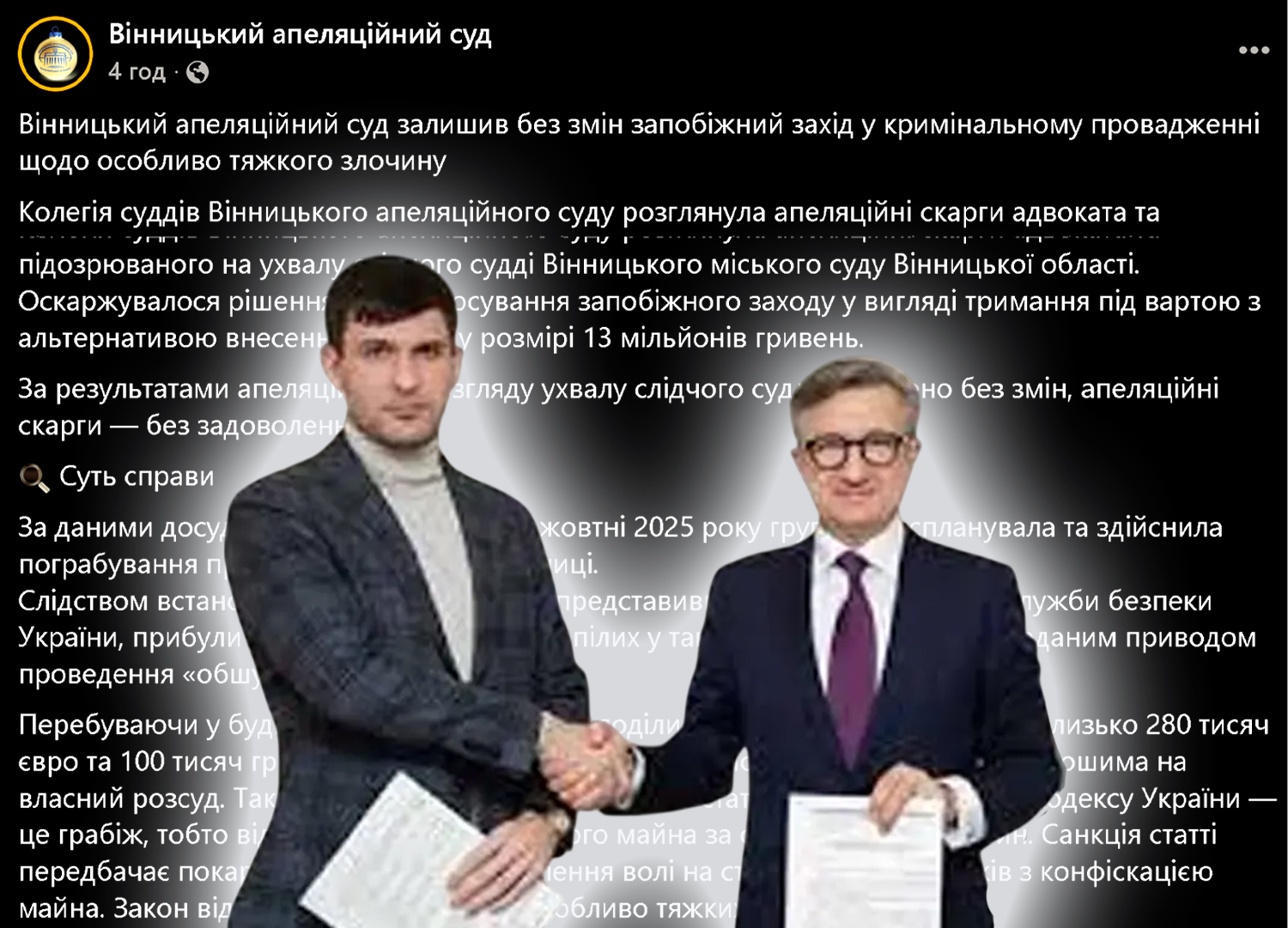 Вінницький апеляційний суд не змінив запобіжний захід «нальотчикам», які у жовтні 2025 року, приїхавши до Вінниці, скоїли зухвале пограбування літнього подружжя. Феміда виявилася невблаганною як до колишнього голови Громадської ради при Міністерстві з питань тимчасово окупованих територій часів уряду Володимира Гройсмана, що має тісні зв’язки з народним депутатом і бізнесменом Сергієм Тарутою, так і до чинного поліцейського, якому правоохоронці інкримінують цей резонансний злочин.