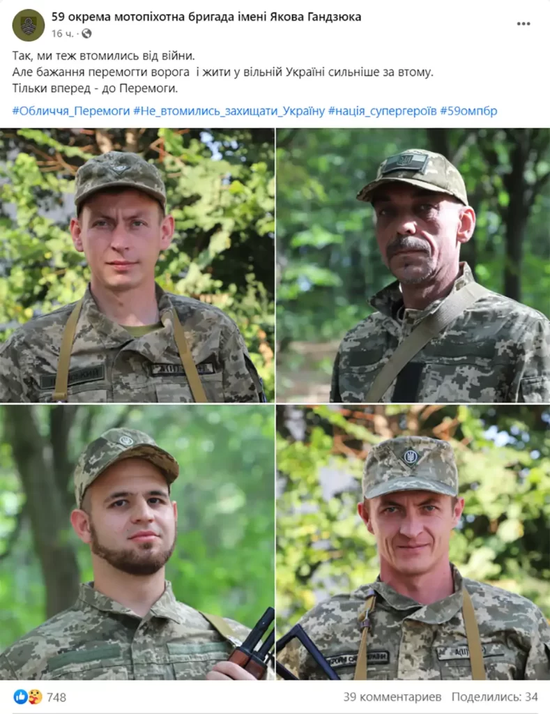 «Так, ми теж втомились від війни, – пишуть бійці 59-ої окремої мотопіхотної бригада ім. Якова Гандзюка на офіційній сторінці підрозділу в соцмережах. – Але бажання перемогти ворога і жити у вільній Україні сильніше за втому».