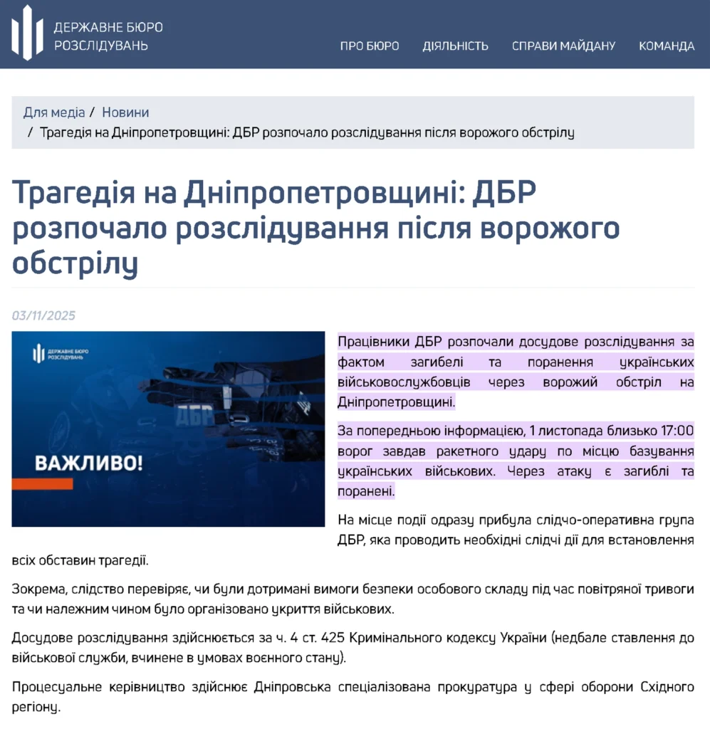 3 листопада 2025 року Державне бюро розслідувань (ДБР) повідомило про розпочате досудове розслідування за фактом загибелі та поранення військовослужбовців за статтею про недбале ставлення до військової служби (ч. 4 ст. 425 КК України).