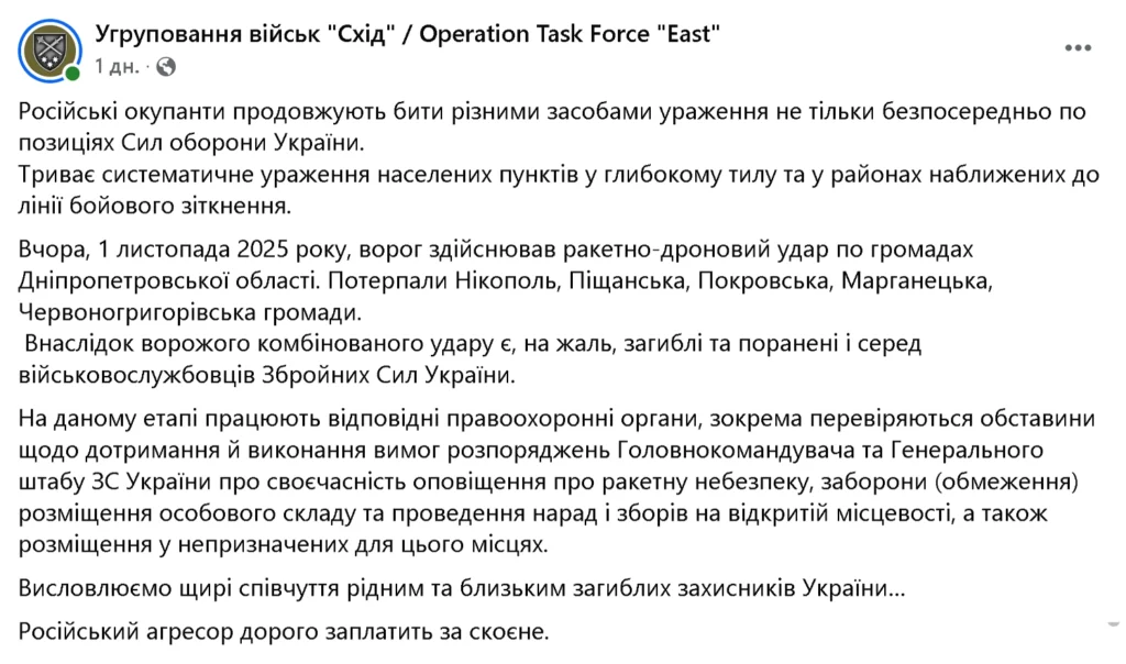 2 листопада 2025 року угруповання військ «Схід» підтвердило факт комбінованого ракетно-дронового удару по Дніпропетровщині 1 листопада, внаслідок якого є жертви серед військових. У командуванні зазначили, що проводиться перевірка обставин виконання наказів Генерального штабу та Головнокомандувача щодо обмеження масових заходів на відкритій місцевості.