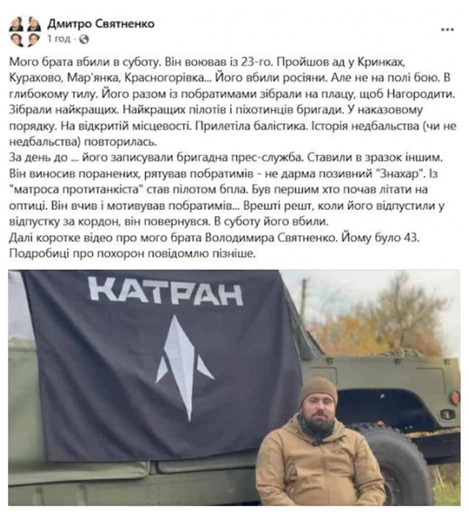 «Прилетіла балістика. Його разом із побратимами зібрали на плацу, щоб нагородити. Зібрали найкращих», — написав Дмитро Святненко.