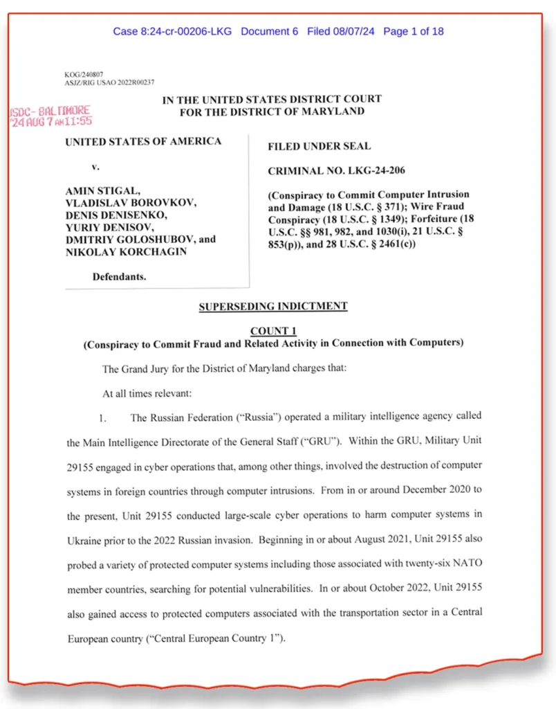 У справі, яку розглядає Велике Журі суду штату Меріленд, фігурують п’ять офіцерів військової частини 29155 головного управління розвідки генштабу збройних сил російської федерації, яким пред’явлені обвинувачення у зломі українських урядових мереж, в тому числі і «Дії». (військова частина 29155 – це так званий 161-й центр підготовки спеціалістів, один з елітних та засекречених частин ГРУ з дислокацією у Москві).