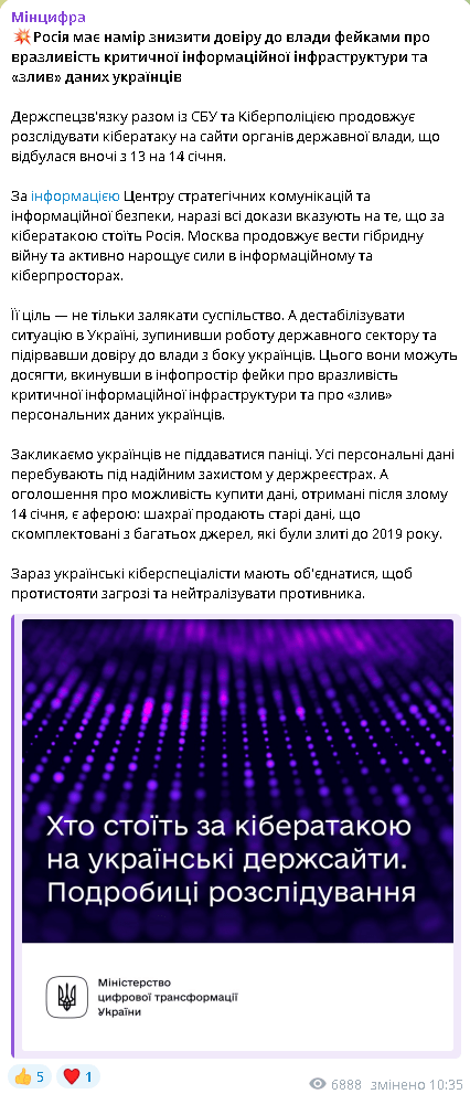 Масштабна кібератака на сайти органів державної влади України відбулася напередодні повномасштабної війни вночі з 13 на 14 січня 2022 р.