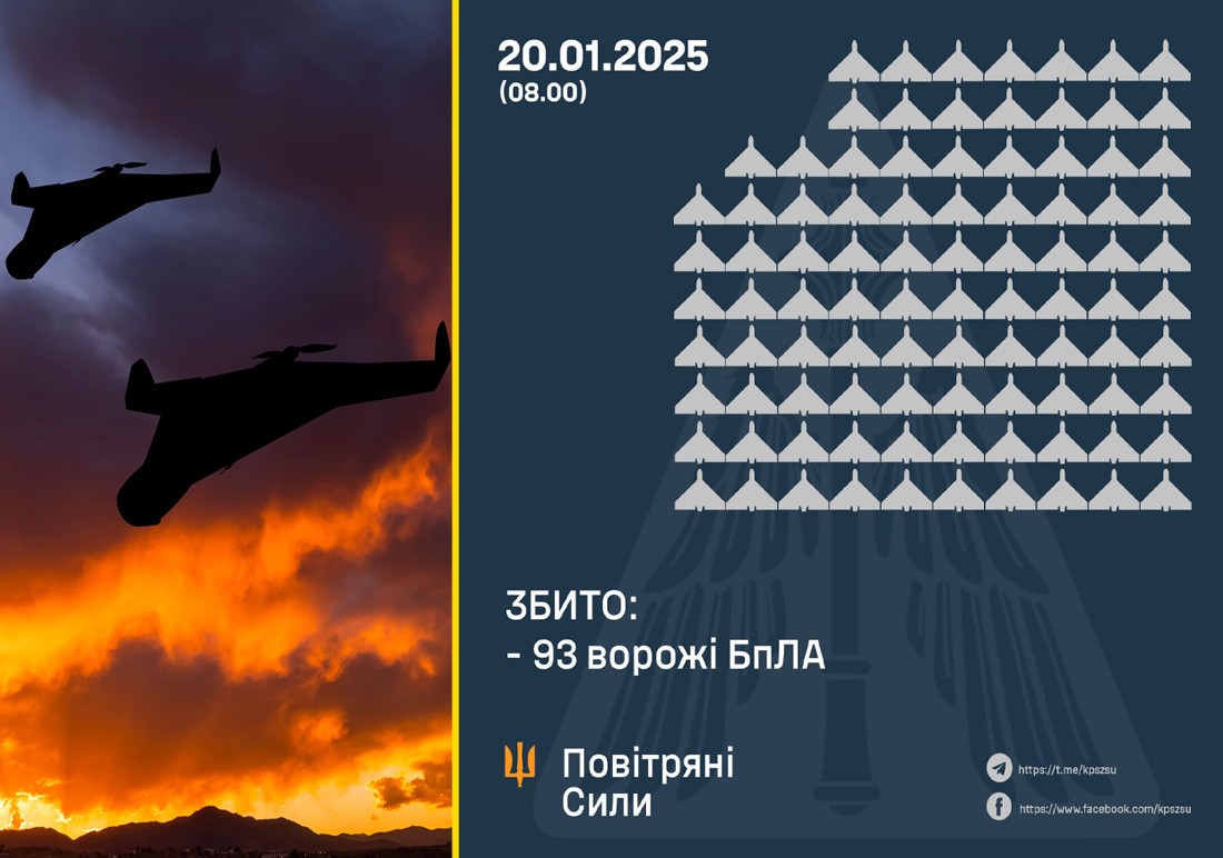 Станом на 08:00 захисникам вдалося знищити 93 ударні дрони типу «Shahed» та інші безпілотники у 13 областях України, зокрема в Полтавській, Сумській, Харківській, Черкаській, Чернігівській, Київській, Хмельницькій, Вінницькій, Кіровоградській, Дніпропетровській, Миколаївській, Херсонській та Донецькій.