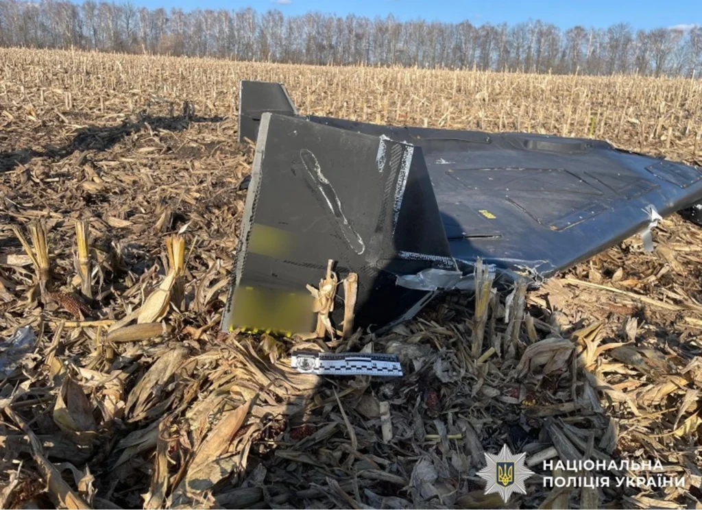 На уламках кіля (вертикального стабілізатора зі скошеним переднім краєм, що є візитівкою цих дронів) поліцейські блюром приховали маркування. Зазвичай саме там окупанти наносять літеру (наприклад, «М») та серійний номер апарата.