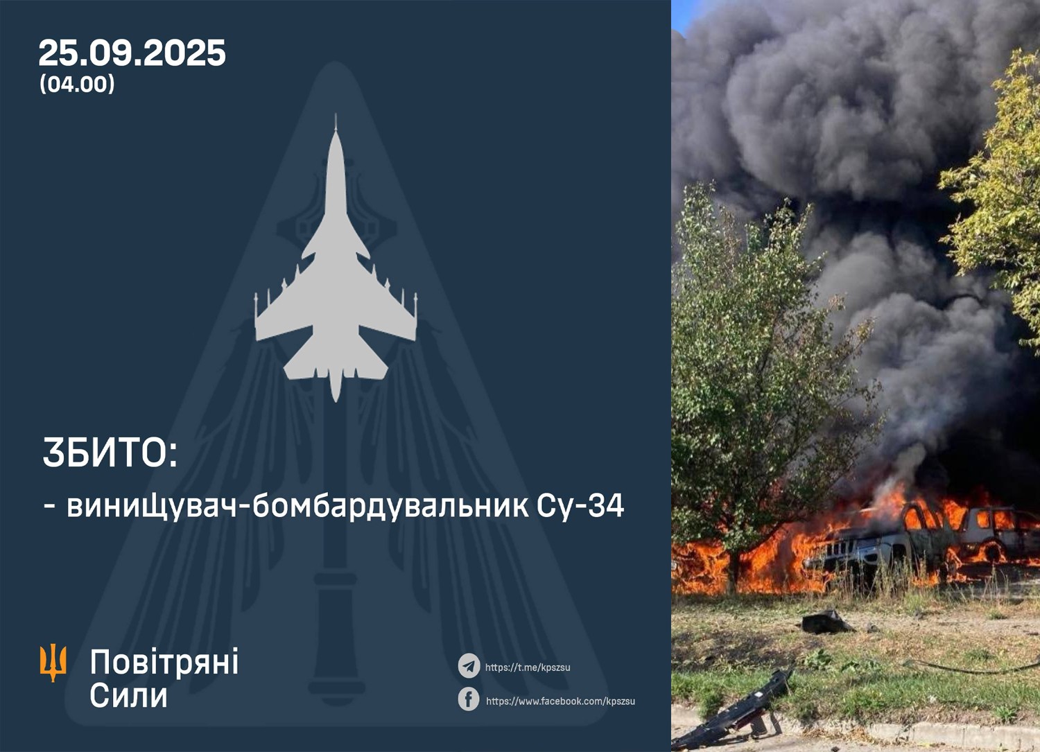 Близько четвертої години ранку 25 вересня 2025 року українські сили протиповітряної оборони знищили російський фронтовий бомбардувальник Су-34 на Запорізькому напрямку. Про це повідомили у Командуванні Повітряних Сил ЗСУ.